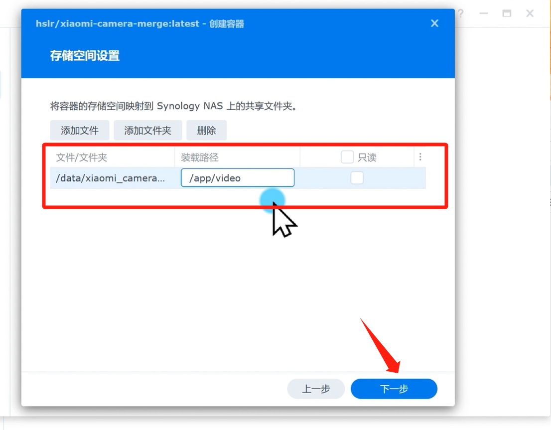 下一步,端口页面,不操作。继续下一步储存空间添加,点击添加文件夹,选择你监控储存在群晖的视频根目录,转载路径填写/app/video,如下图: